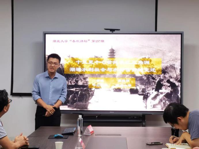 2025年9月17日下午,教育部高等学校历史学类专业教学指导委员会秘书长、中山大学副校长谢湜教授应邀做客春秋讲坛,为我们师生作了题为《13-17世纪长江三角洲湖塘水利社会与水神信仰的变迁》的主题演讲。院长黄柏权教授主持,雷平教授、学报编辑部马建强副编审及部分青年教师和博硕士研究生参加了讲座。
