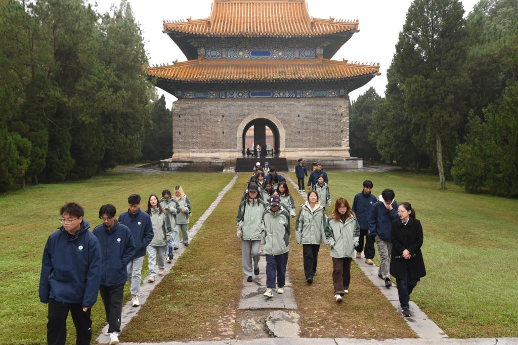 在讲解员的引导下,大家沿神道依次参观了碑亭、石像生群、方城明楼等主要建筑遗存。在碑亭前,大家认真聆听碑文背后的历史故事,对明代皇家陵寝的礼制与文化内涵有了更直观的认识。神道两侧的石人石兽造型各异、雕刻精细,展现了明代皇家陵寝的宏伟规制与精湛工艺。登上方城明楼时,俯瞰整个陵园依山傍水、轴线分明的布局,同学们纷纷感叹古代工匠的智慧与匠心。
