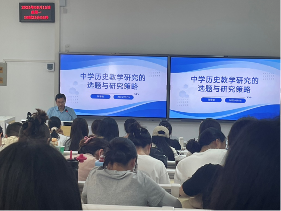 2025年9月15日下午,武汉市教科院高中历史教研员张尊健老师应邀在4-605教室为我们师生作了题为“中学历史教学研究的选题与研究策略”的专题讲座。此次讲座由张宁老师主持,2022级历史学师范专业本科生、2024级学科教学(历史)专业研究生到场聆听。