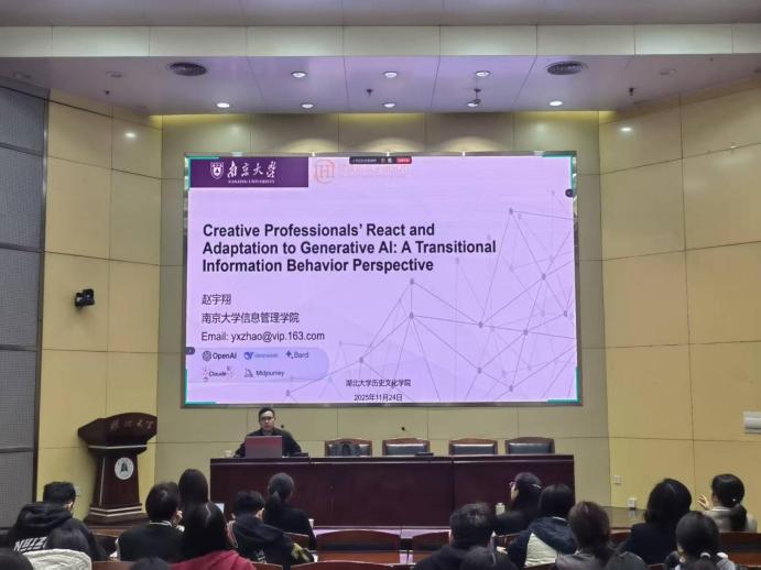 2025年11月24日上午,南京大学赵宇翔教授应邀做客我们“中和讲坛”,在必赢中国官方网站图书馆思诚厅作了题为“人智竞争视角下创意工作者应对生成式的适应性信息行为及转折性信息实践”的专题讲座,现场学术氛围浓厚,我系教师、各级研究生、本科生踊跃参与,讲座由我系主任李彩容副教授主持。