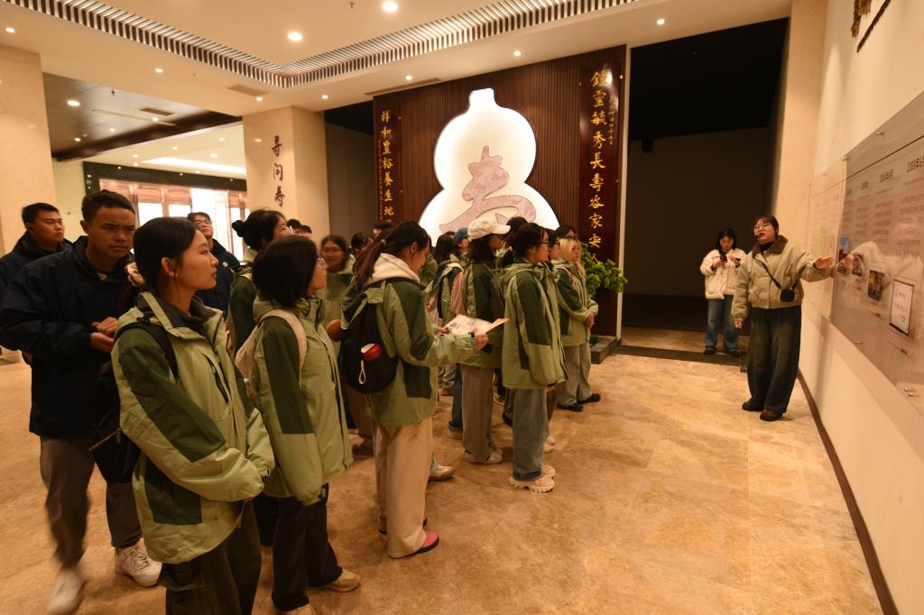 在专业讲解员的带领下,同学们首先参观了明显陵人文旅游展馆和钟祥长寿文化展示馆。在明显陵人文旅游展馆,大家通过文物展品、历史图片和多媒体互动,系统了解了明显陵背后所蕴藏的故事和人文内涵。在长寿文化展示馆,同学们对钟祥地区独特的长寿现象、传统养生理念以及相关民俗文化有了直观认识。